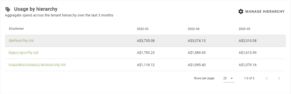 The result of the tag hierarchy is visible as the Usage by Hierarchy view on the Finance Dashboard and via the tabs on the Cost Explorer.