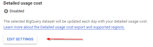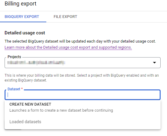 Before you enable your Cloud Billing data to export to BigQuery, you must create at least one BigQuery dataset to manage your exported data. This can be done from the Detailed usage cost billing export screen.