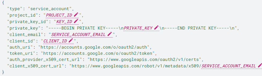 Attach or paste in the json Service Account Key created in the step above, as well as the Dataset ID and the Table ID for the created BigQuery data export.