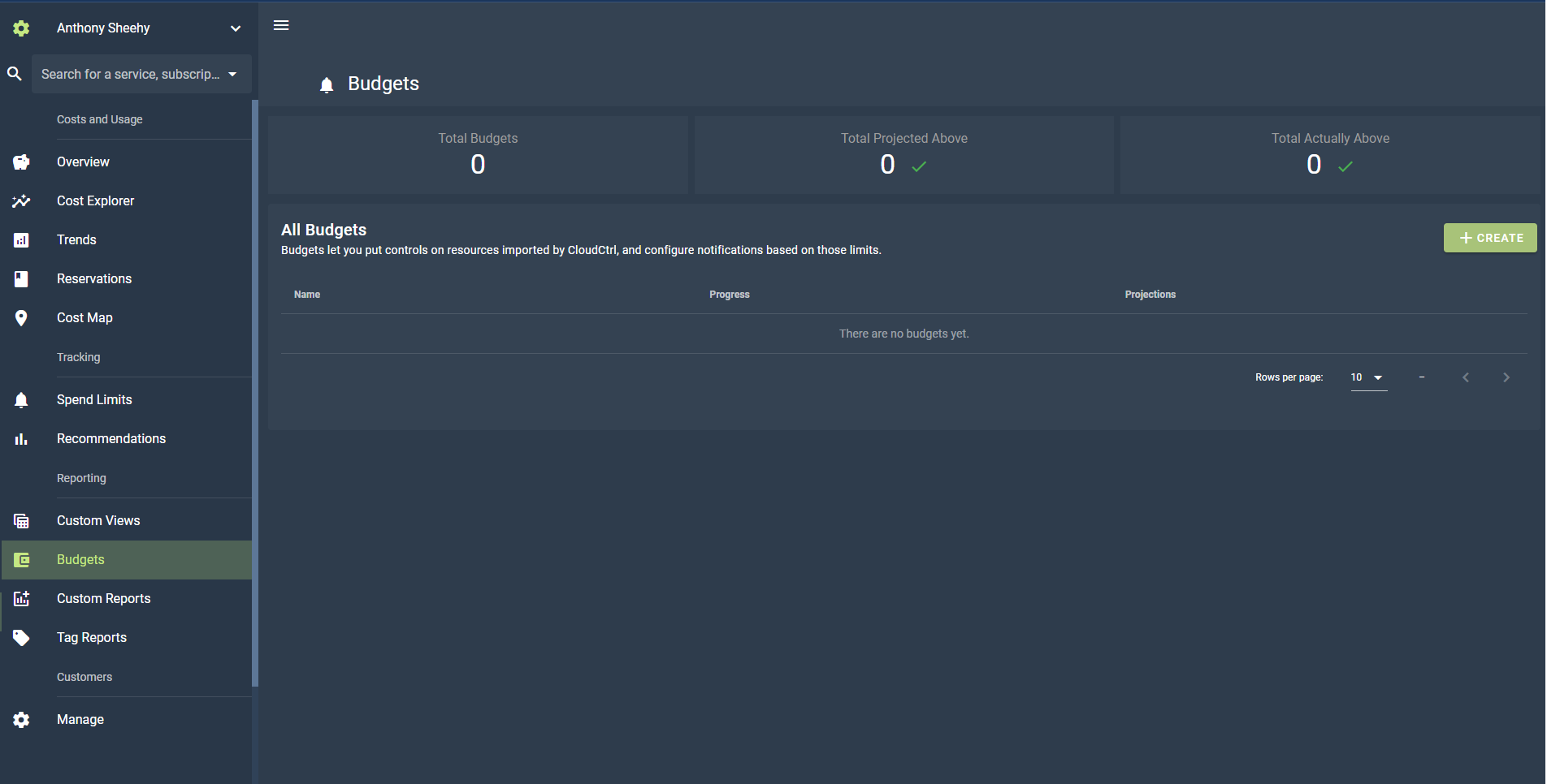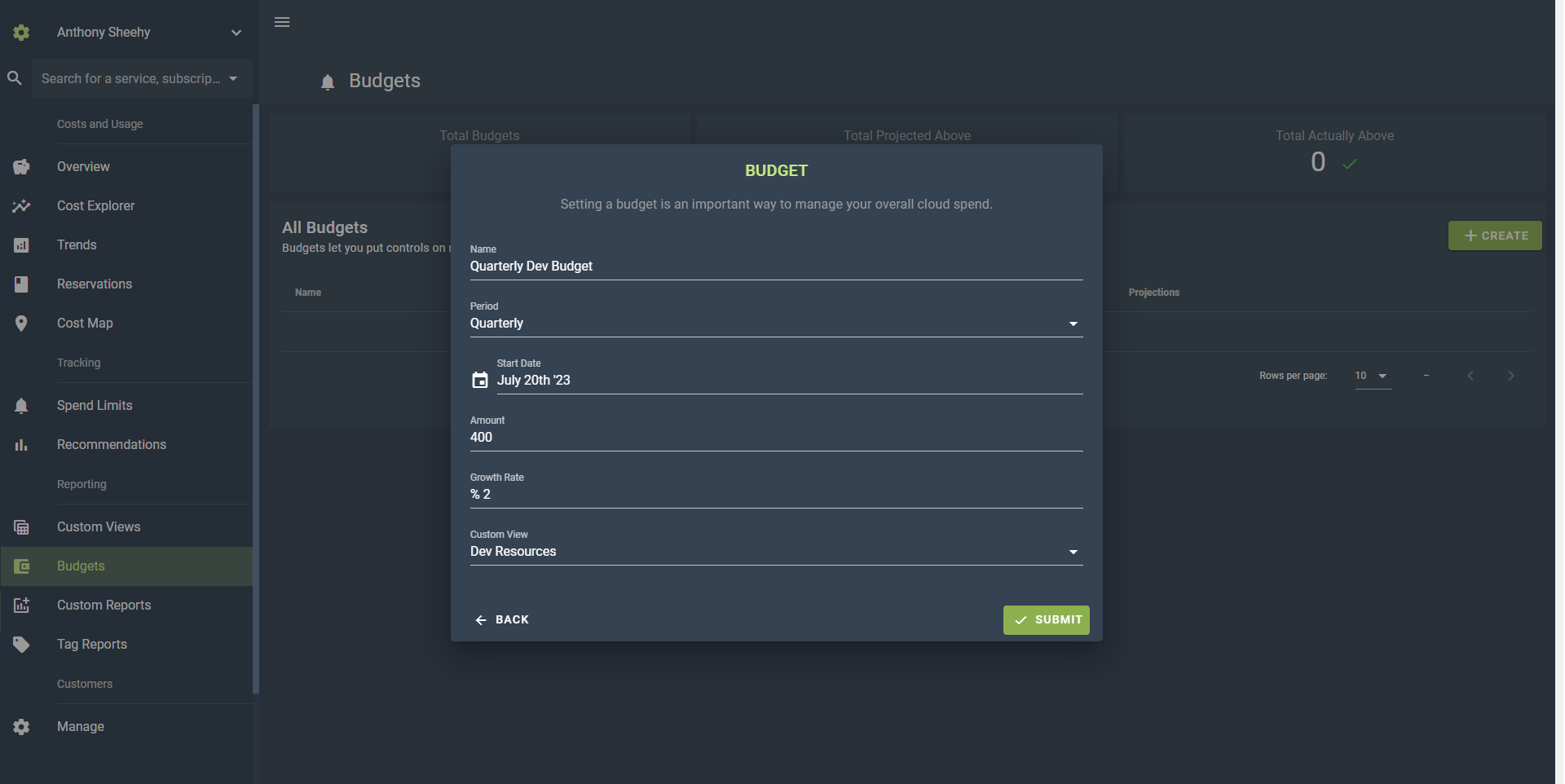With the Custom Views in place, the next step is setting up Budgets. Budgets provide granular control over resource consumption costs, directly tied to your custom views. This flexible approach allows you to set multiple budgets for each custom view, accommodating different aspects or timeframes of cloud usage. Notifications are sent when Tenant spend is projected to exceed 75%, 90%, and 100% of the budgeted amount. A user can unsubscribe from all alerts (Budget and Spend Limit), using the 'Notification Settings' screen, accessed through the user menu, available in the bottom left of the screen.
