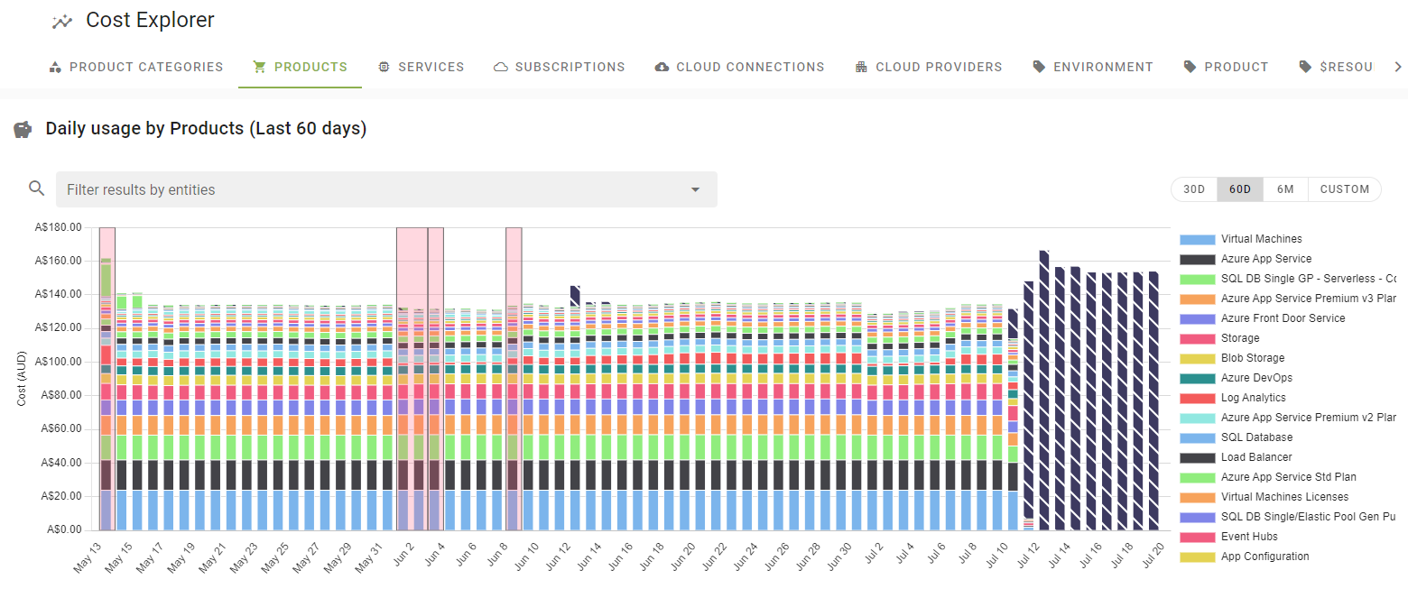 The Cloud Ctrl Cost Explorer dashboard provides a breakdown of spend by a range of helpful groupings. Apart from the standard groupings (Product Category, Product, Service, Subscription, Cloud Connection, Cloud Provider), any Tag Key configured in the Tag Hierarchy is also available as a grouping for spend breakdown. Filtering is also available in order to focus in on specific entities and will remain active when moving between top level groupings. Another method to focus on a particular item within a grouping, is by clicking on a single bar in the graph to drill into an entity.