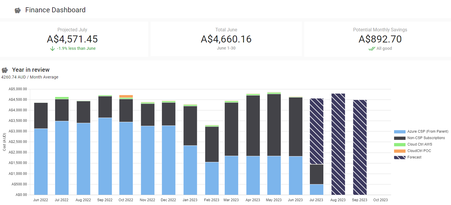 The Cloud Ctrl Finance dashboard provides a financial spend overview of all your cloud accounts. It shows the projected spend for the current calendar month, the total for the previous month for comparison, as well as any possible savings to be made by applying recommendations.