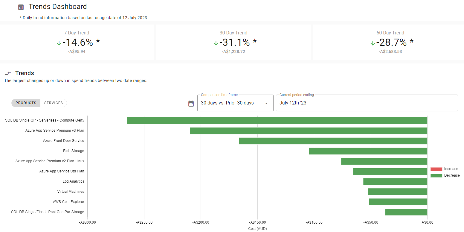 The Trends dashboard provides insight into the top Products and Services that are varying by spend. Entities are compared between two time periods to understand which services and products contributed to the largest differences in spend -/+%.