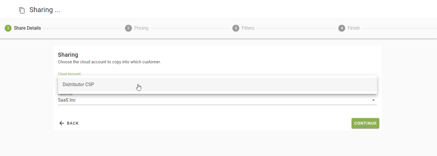 On the first step of the share wizard you need to select the source cloud account you want to share data from, and the customer who you want the data to be shared with.
