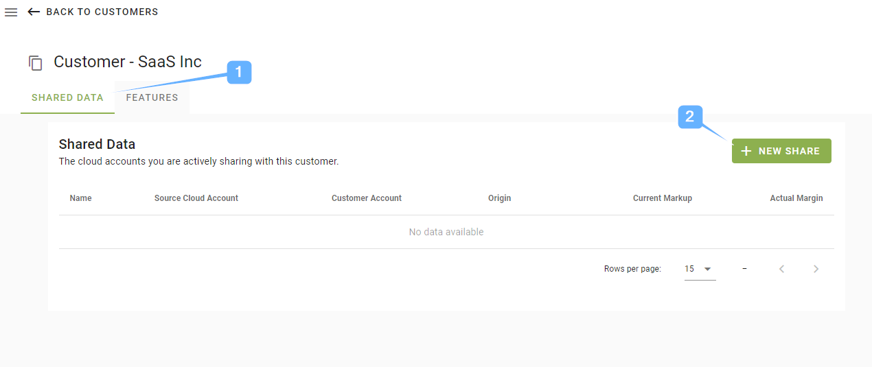To create a share browse to the Customer from the Customer Managent link and ensure you are on the Shared Data tab (1), then click the New Share button (2) to start the share wizard.