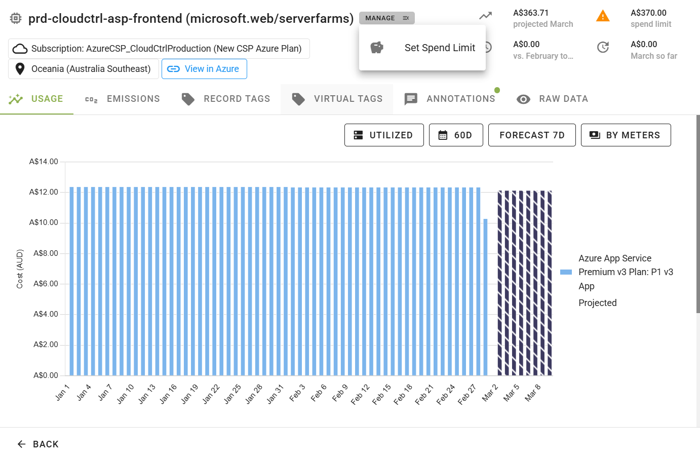 Spend Limits let you put Thresholds on resources imported by Cloud Ctrl, and configure notifications based on those limits. These limits will not stop resources or affect operation in any way, rather you will receive warning emails when the spend for the configured tag / service / subscription / cloud account is projected or actually exceeds the configured spend limit.